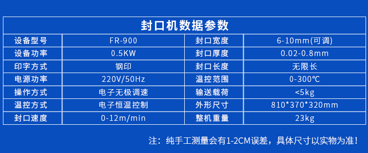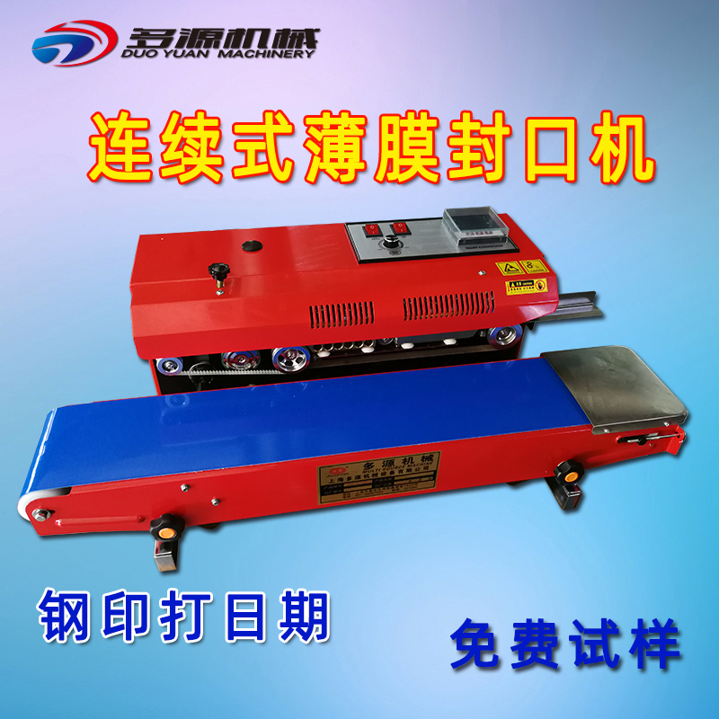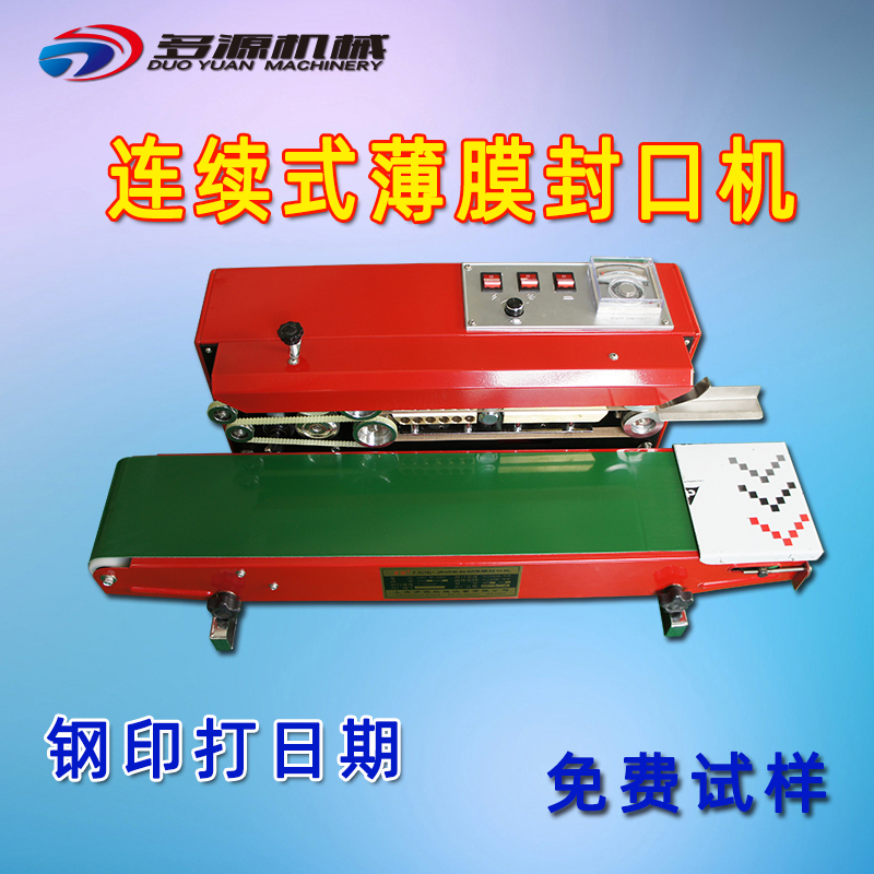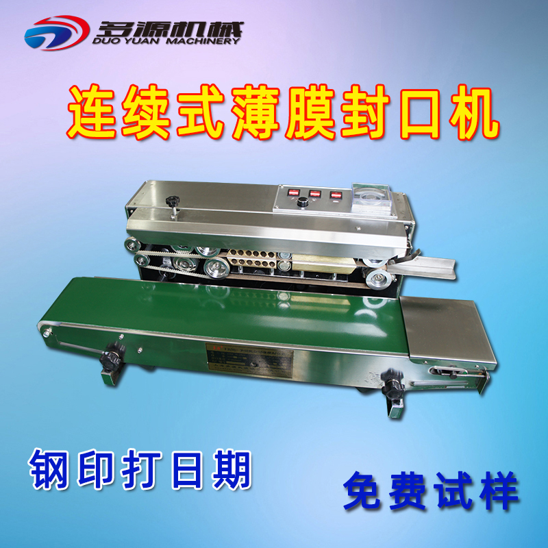 自动连续式薄膜封口机具有:连续输送、封口、印字(分钢印打码和墨轮印字打码、打生产日期及批号等)一次完成之功能、并可卧、立、落地式使用,采用电子恒温控制和无极调速的传动机构,适用于多种材料塑料薄膜封口。