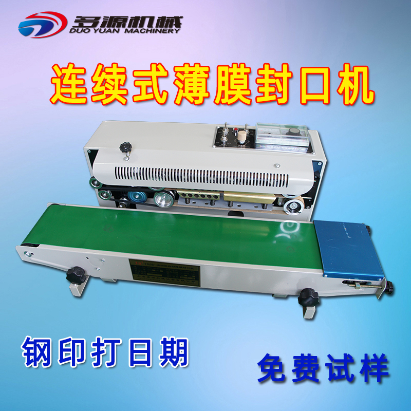 自动连续式薄膜封口机具有:连续输送、封口、印字(分钢印打码和墨轮印字打码、打生产日期及批号等)一次完成之功能、并可卧、立、落地式使用,采用电子恒温控制和无极调速的传动机构,适用于多种材料塑料薄膜封口。