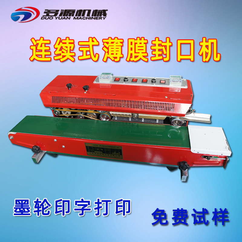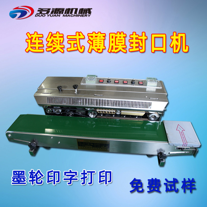 上海多源牌自动连续式薄膜封口机具有:连续输送、封口、印字(分钢印打码和墨轮印字打码、打生产日期及批号等)一次完成之功能、并可卧、立、落地式使用,采用电子恒温控制和无极调速的传动机构,适用于多种材料塑料薄膜封口。