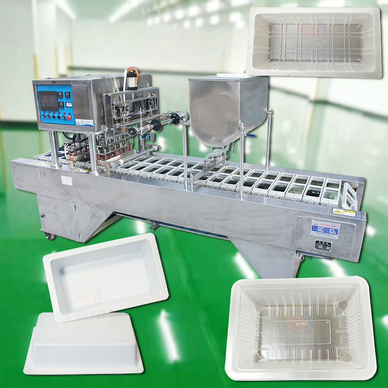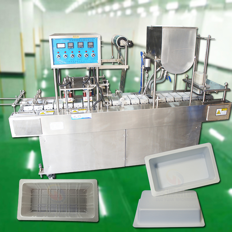 灌装封口机系列塑料、瓶盒等塑料品自动灌装机能自动完成灌装充装、热压封口切膜、色带打印生产日期的自动封盖覆膜机。适用于内酯豆腐(盒装豆腐)果汁、牛奶、豆浆,豆奶等流动性比较好的塑料杯盒的自动封盖封膜机。