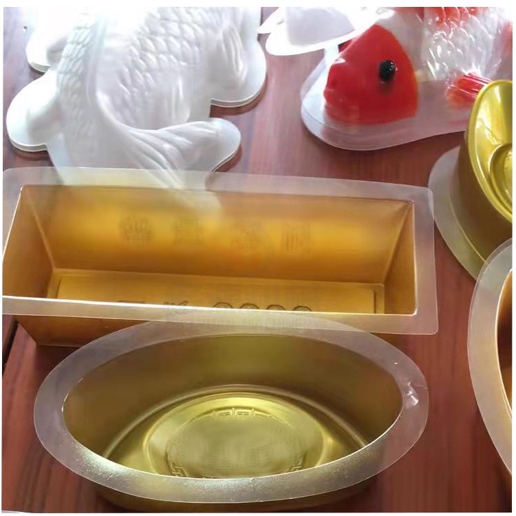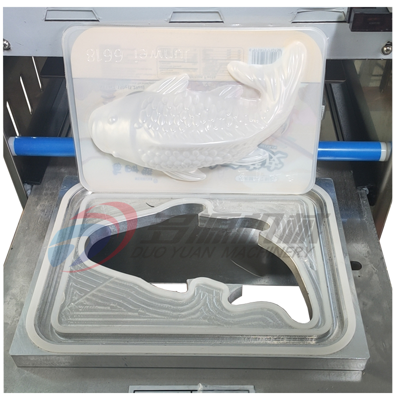 鱼型盒子年糕鱼封口机一次性鱼型塑料托盘散装打包用封口热压封口机,本机是气动封口(立柜式结构),一出二的鱼型模具(一次同时封2个鱼型盒子),带切边切膜的功能,自动收卷废膜,操作方便,可以对鱼型的塑料盒子或者其它动物类形状的托盘盒子进行热压覆膜封口打包使用。