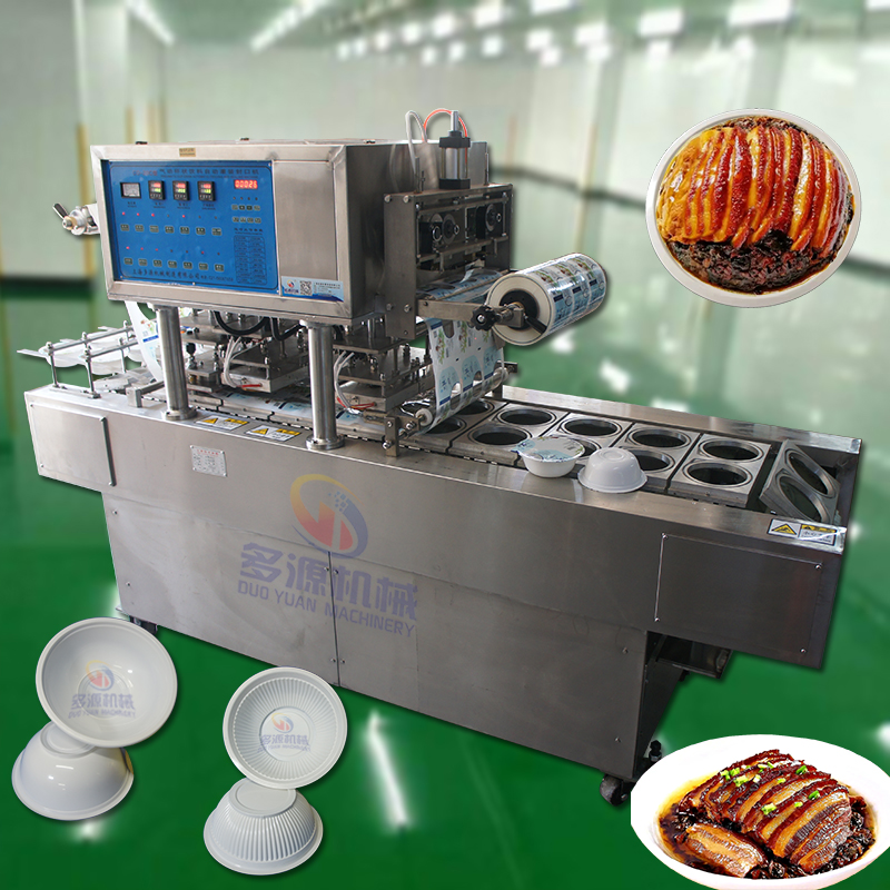 蒸碗-碗装扣肉塑碗自动连续式封口封膜机是对塑料盒子,塑料碗,塑料杯等塑料制品进行自动封口的一款机械设备。扣肉塑碗自动连续式封口封膜机是具有自动封口,自动纠正图案对位封膜,机械式色带打印生产日期,自动切膜切边等多功能于一体。本机可以对一次性的塑料扣肉圆碗进行独立包装封口,适用于食品厂等肉类食品的打包封膜-蒸碗封口机。