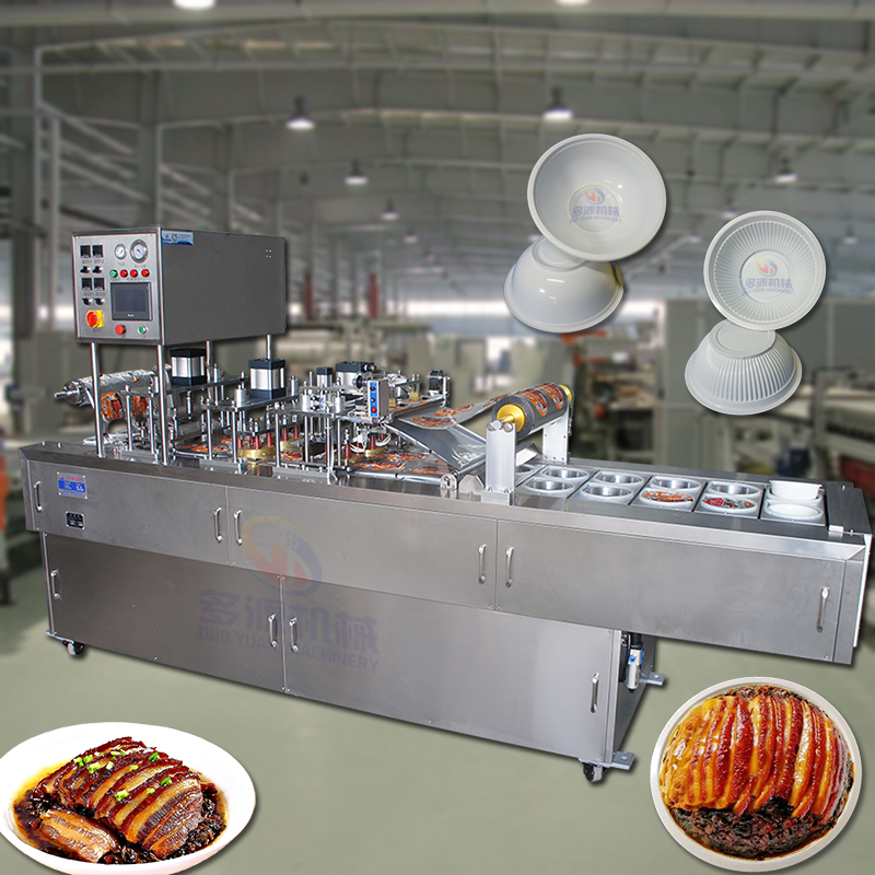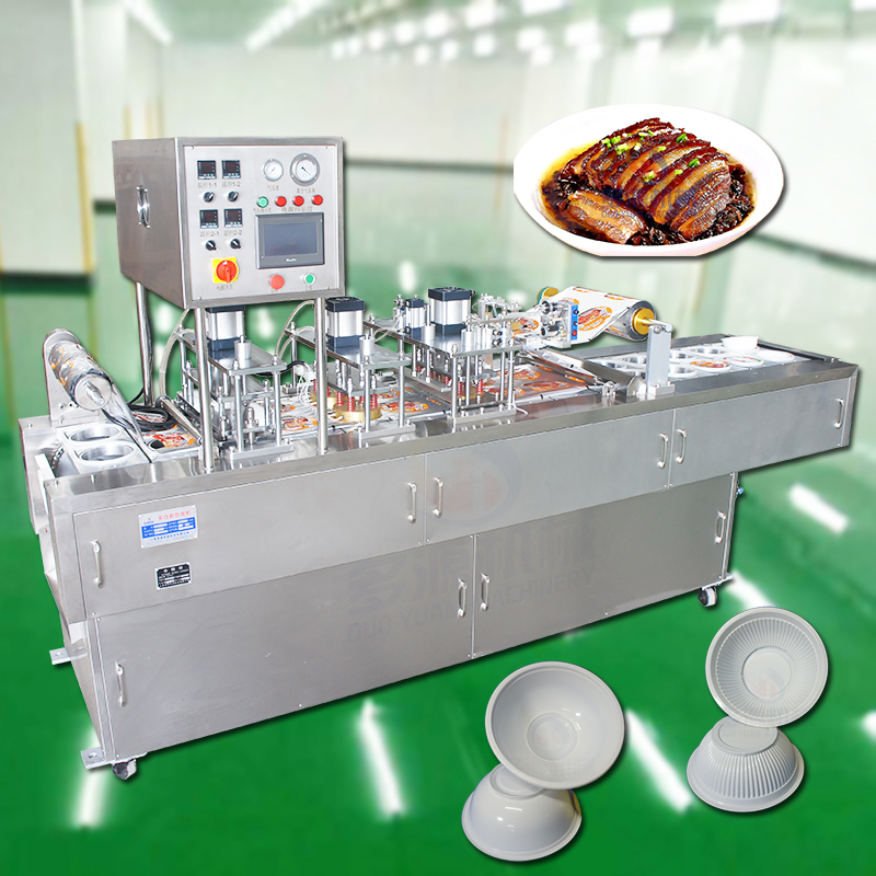 021-56067559蒸碗扣肉抽真空餐盒托盘封口机采用汽缸驱动热压封口的额方式,本机采用PLC触摸屏控制程序,智能数字显示温控表来控制热封温度,封口强度高,封切美观。
