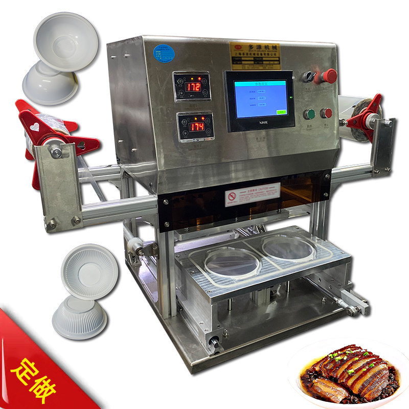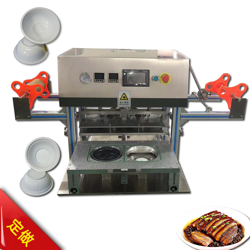 机器采用非标定制(长正方形、圆形、多边形及异形的塑料托盘餐盒都可以定做模具的),根据包装容器的实际尺寸定制热合封口模具,机架采用优质加厚304不钢机壳,美观牢固,智能PLC控制系统,自动光标控制精准定位封口膜的图位,人机操作界面,操作方便、简单易懂。广泛适用于各种材质封口膜(铝箔/PE/PP/PET/PS等包装耗材)的包装容器密封封口。